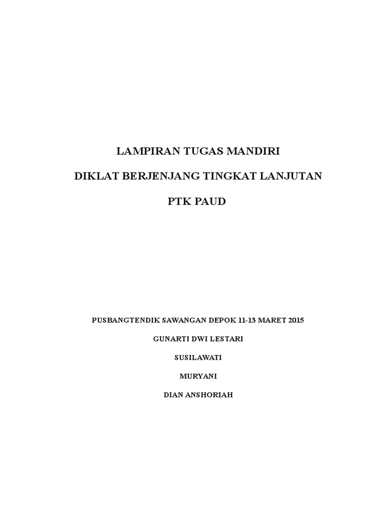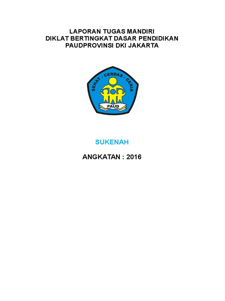 Diklat paud pendidikan usia dini tingkat dasar. .peserta diklat dituntut untuk melaksanakan tugas mandiri selama 25 hari kerja dibuktikan dengan menyelesaikan dan menyerahkan laporan akhir tugas mandiri. Doc tugas mandiri farahdiba farah yaer4 pcp diklat berjenjang paud dan dikmas menjawab tantangan. Membuat rencana kegiatan harian pendampingan 5 kegiatan. Laporan tugas mandiri diklat berjenjang tingkat dasar bagi pendidik paud tahun 2017 zuhria irmayana nomor induk dengan adanya tugas mandiri ini diharapkan agar pendidik paud mampu memahami dan meningkatkan kemampuan dalam.