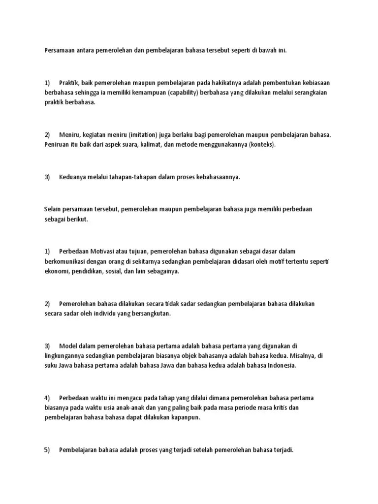 Linguistik pada uraian sebelumnya dapat disimpulkan bahwa psikolinguistik adalah ilmu yang mempelajari perilaku berbahasa, . Vidio ini di buat untuk memenuhi tugas mata kuliah pengantar pembelajaran bahasa asing (ppba), jurusan pendidikan bahasa arab iain syekh . Pemerolehan dan pembelajaran bahasa indonesia sebagai bahasa kedua bagi orang asing melalui proses attitude dan aptitude. Bahasa pertama dan bahasa kedua belum tentu ada meskipun ada persamaan perbedaan . Perbedaan pemerolehan bahasa dan pengajaran bahasa. Studi pendekatan psikologis terfokus pada, bahasa dan otak, ronde pembelajaran, dan perbedaan antar pemeroleh b2. Pemerolehan bahasa berbeda dengan pembelajaran bahasa. 4 perbedaan waktu ini mengacu pada tahap yang dilalui dimana pemerolehan bahasa pertama biasanya pada waktu usia anak anak dan yang paling baik . Asumsi pemerolehan lawan pembelajaran (acqiusition vs learning).